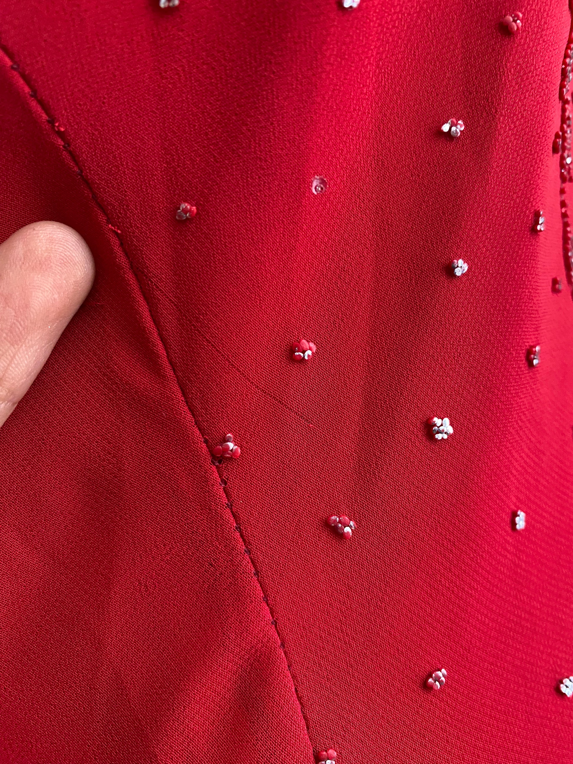 Red dress with silver appliqués